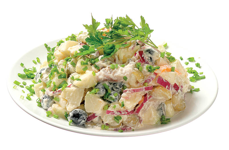 3. Cartofii se curăţă de coajă, se taie cubuleţe şi se amestecă cu ceapa, măslinele, tonul, pătrunjelul şi maioneza.