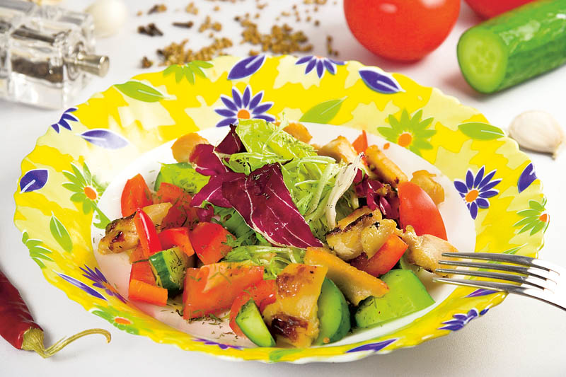 4. După ce s-au pregătit toate legumele proaspete, se pun într-un bol, se presară câteva feliuţe de ardei iute şi se toarnă sosul. Salata se serveşte cu crutoane aromate cu usturoi.