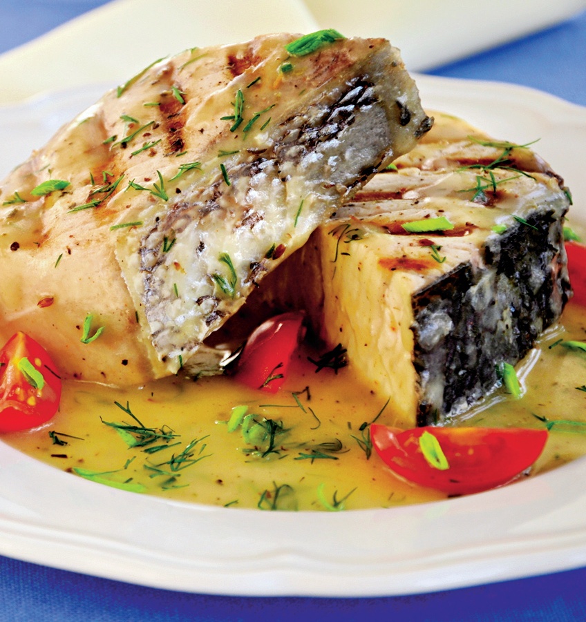 2. Pe grătarul încins se frig medalioanele de peşte şi, pe măsură ce se rumenesc, se scot şi se pun într-un vas. Se presară felioare de usturoi.