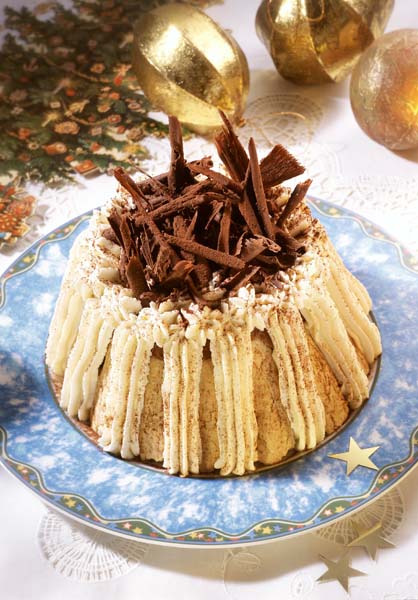 3. Blatul copt şi răcit se aşază pe un platou. Jumătate din cremă se toarnă pe blat, iar restul se pune pe lateral în strat uniform. Se ornează cu frişcă, ciocolată rasă şi cacao cernută. Se lasă la frigider minimum două ore şi apoi se poate servi.