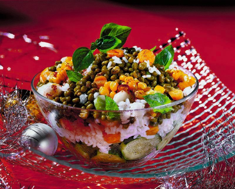 3. Într-un bol, se pun castraveţii spălaţi, curăţaţi şi tăiaţi rondele, morcovii, pătrunjelul, orezul, mazărea şi porumbul. Se condimentează cu sare, piper, ulei de măsline şi oţet balsamic. Salata se ornează cu nucşoară şi frunze de rucola sau de salată verde, după preferinţe.