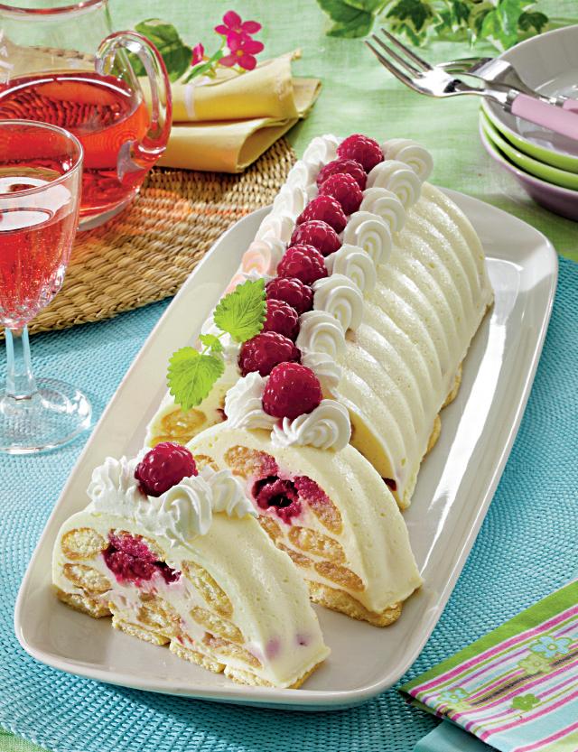 2. Se face un sirop cu 50 ml apă şi 50 g de zahăr şi se lasă la fiert 5 minute la foc mic. După ce s-a răcit, se adaugă lichiorul de fructe. Se unge o tavă de chec cu ulei şi se presară cu zahăr pudră. Se pune un strat de cremă, se presară boabe de zmeură şi apoi un strat de pişcoturi însiropate cu siropul din lichior şi zahăr. Se pune un alt strat de cremă deasupra, zmeură şi un nou strat de pişcoturi până la terminarea ingredientelor.