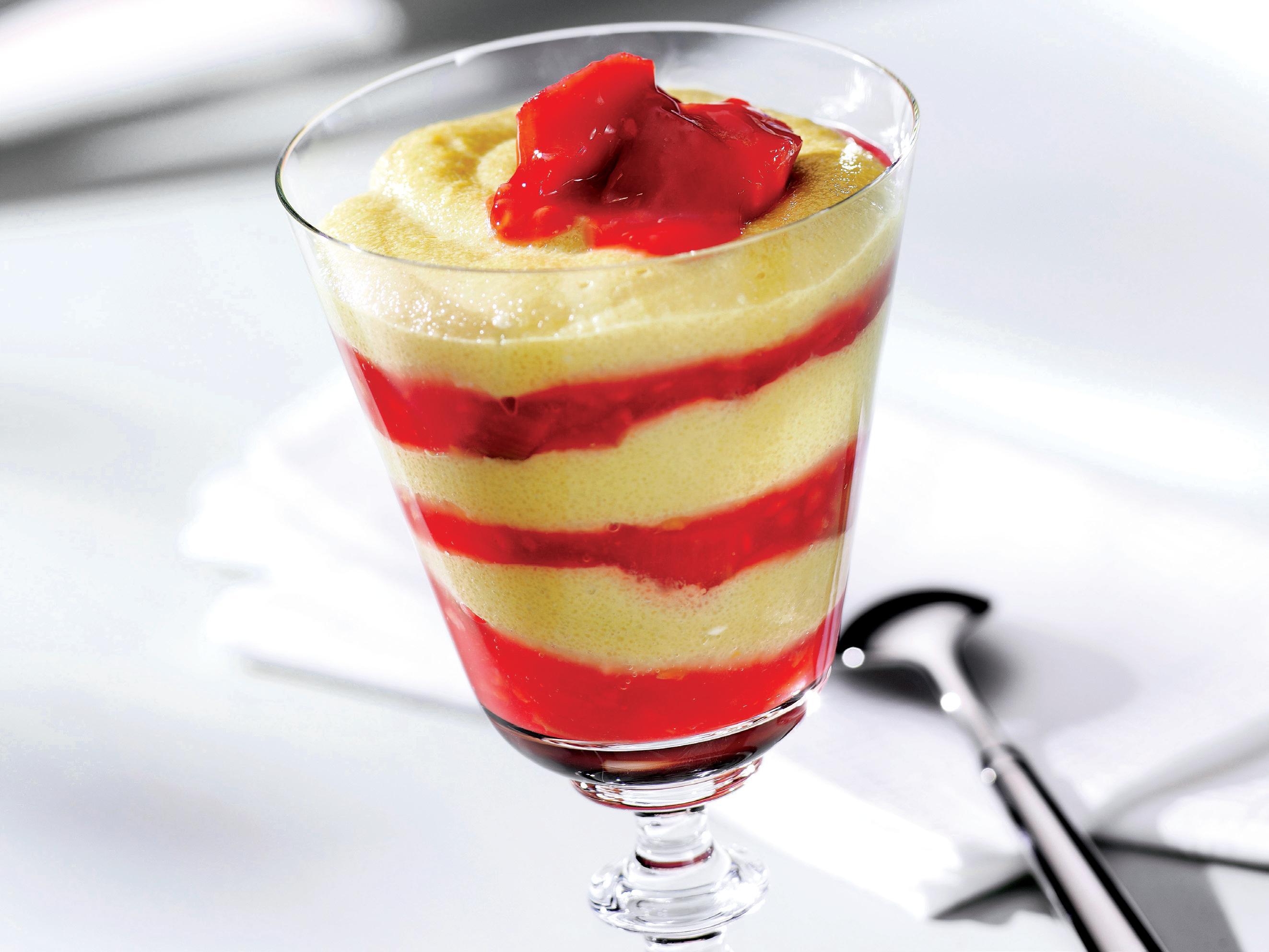 3. Zmeura din compot o zdrobiţi şi începeţi să o asezonaţi în felul următor. Pregătiţi 4 cupe de sticlă şi puneţi un rând de pastă de zmeură, un rând de cremă de griş şi tot aşa, până arată ca în poză.