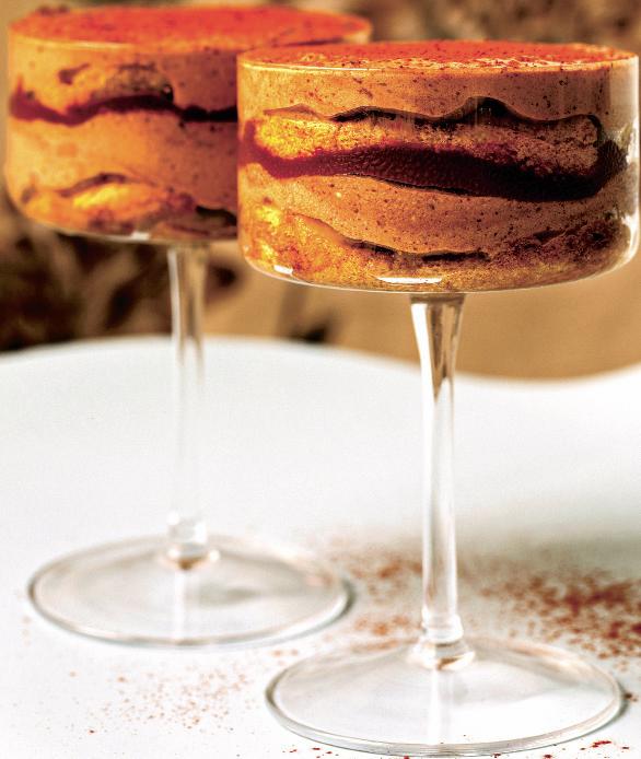 3. Se taie blatul rece după forma paharelor în care se prepară prăjitura. Se pune în fiecare pahar câte o bucată rotundă de blat şi se însiropează cu un sirop făcut din cafea solubilă, apă minerală, zahăr şi esenţă de vanilie. Se acoperă apoi cu crema de ciocolată şi se pune iar un strat de blat însiropat şi cremă până se umple fiecare pahar. Se serveşte rece, presărat cu fulgi de ciocolată.