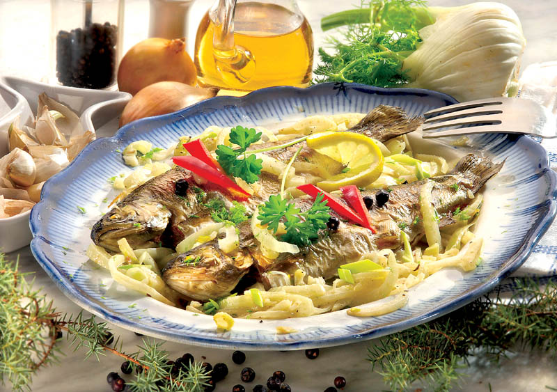 4. Din când în când se stropeşte cu sosul din tavă şi, când este gata, se aşază pe un platou împreună cu ceapa şi feniculul copt. Se serveşte ornat cu frunze de pătrunjel şi felii de lămâie.