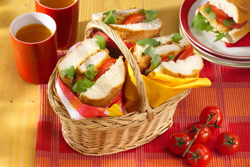 4. Se taie baghetele în două, apoi se taie şi pe orizontală şi se ung cu crema de brânză. Se pun roşiile tăiate felii, şniţelele de pui şi salata verde şi se împachetează în şerveţele.