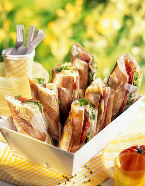 2. Baghetele se taie în două sau trei bucăţi, apoi se taie pe orizontală şi se ung cu pasta de brânză. Se pun apoi câteva frunze de salată verde, roşiile, caşcavalul tăiat felii, şunca presată şi castraveţii tăiaţi rondele.