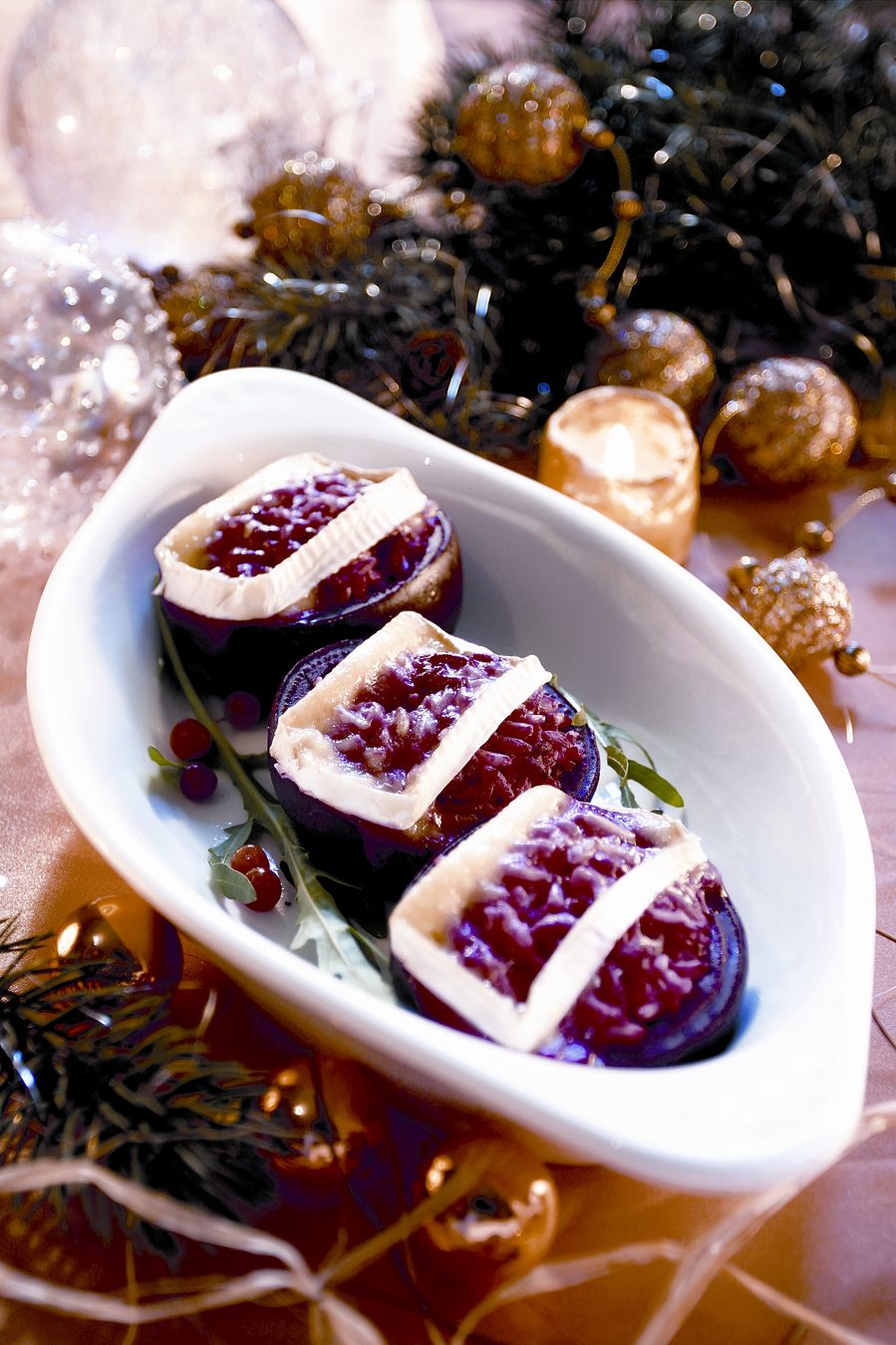 2. Se umplu jumătăţile de sfeclă cu orezul preparat. Se pune deasupra o feliuţă de brânză şi în vârf încă o linguriţă de orez.