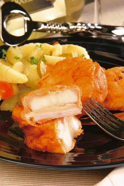 2. Pe rondelele de mere se aşază feliile de caşcaval şi muşchiul file. Se prind cu scobitori în două sau trei locuri, apoi se dau prin compoziţia de ou şi se prăjesc în ulei încins. Se lasă doar câteva minute pe fiecare parte, apoi se scot scobitorile şi se pun la scurs pe un platou cu hârtie absorbantă.