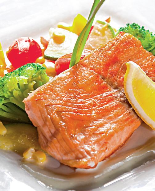4. Se curăţă și se spală legumele. Broccoli se opărește în apă cu sare și apoi se desface bucheţele. Se topește untul și se înăbușe dovleceii tăiaţi cubuleţe, porumbul, ardeii și bucheţelele de broccoli fierte. Se condimentează cu sare și piper și se servesc cu somonul fript. Se ornează cu feliuţe de lămâie.
