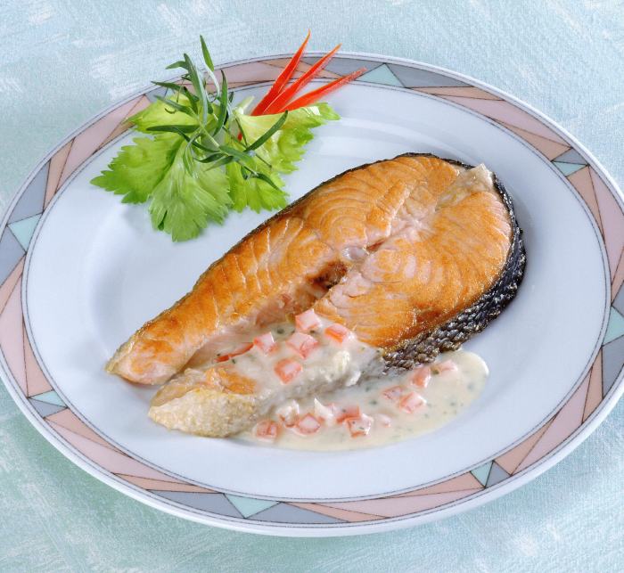 3. După ce s-a făcut bine somonul, se stropește cu sosul preparat și se servește cu usturoiul tăiat rondele și frecat cu sare. Se ornează cu felii de lămâie și cu frunzulițe de mărar proaspăt. Se presară și câteva boabe de piper.