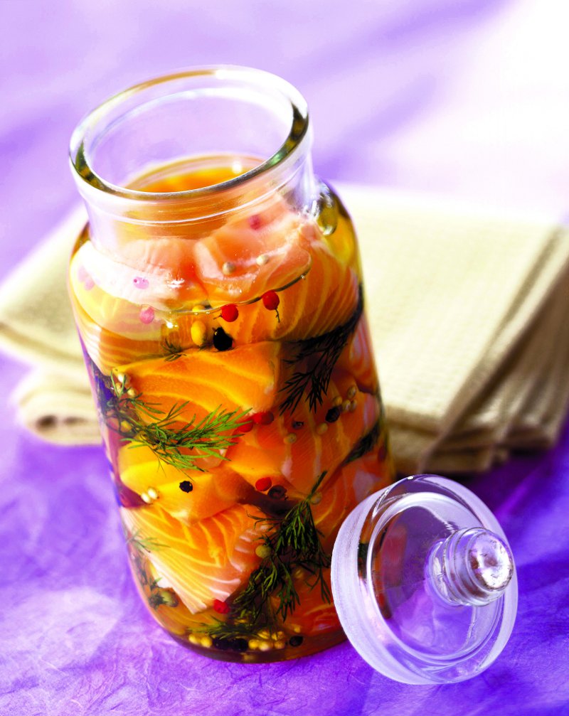 6. Se aşază pe fundul unui borcan o bucată de somon. Se acoperă cu mărar, boabe de piper şi ulei de măsline.