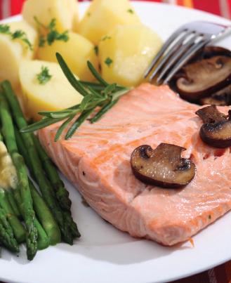 - Toate legumele se pun într-o tavă unsă cu ulei şi se bagă în cuptor. Somonul se serveşte împreună cu legumele gratinate şi se ornează cu feliuţe de roşii, muştar şi pătrunjel verde tocat mărunt.