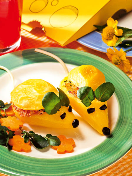 4. Se aşază şoriceii în tava tapetată cu puţin unt şi se lasă 20 de minute la cuptor. Ochii se fac din măsline, urechile din frunze de busuioc, codiţele din spaghete fierte şi se servesc călduţi pe un platou ornat cu floricele din morcovi.