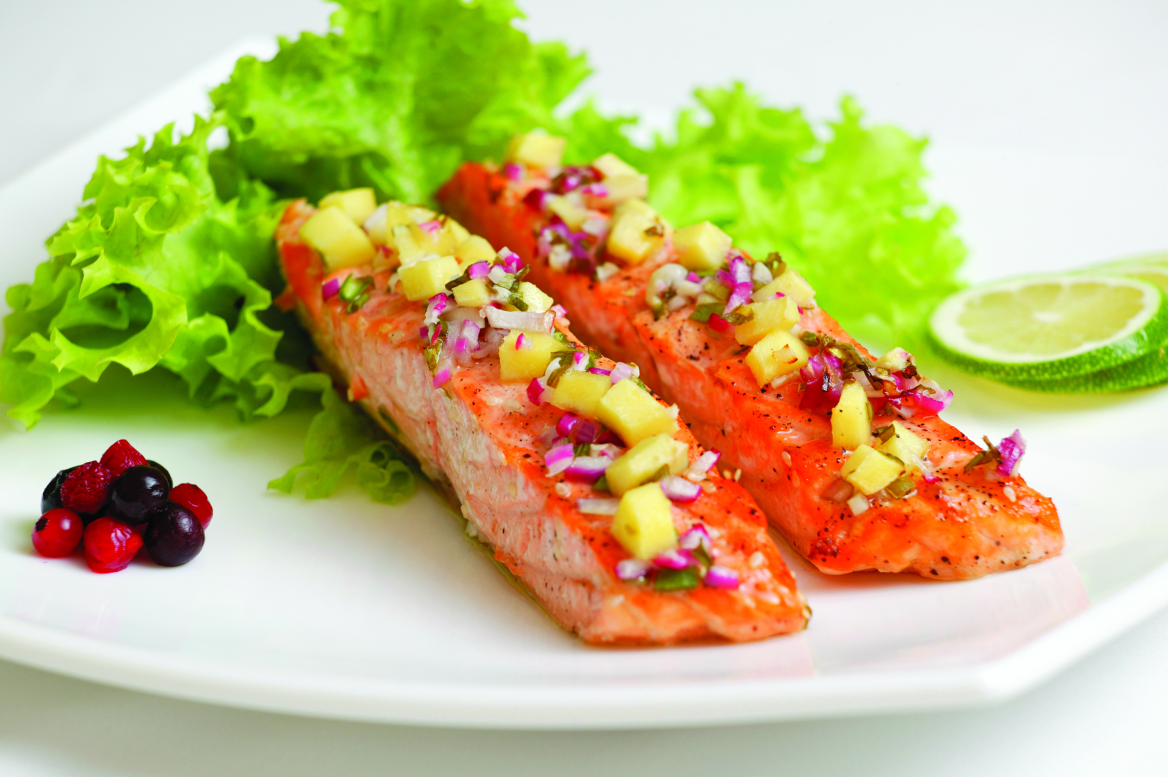 Scoateţi sosul de mango din frigider şi lăsaţi‑l să ajungă la temperatura camerei. Puneţi câte o frunză mare de orice fel de salată verde pe fiecare dintre cele 4 farfurii. Adăugaţi sosul de mango peste frunza de salată, împărţit în mod egal între cele 4 farfurii.