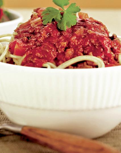 4. În acest timp, se opăresc roşiile, se decojesc, se zdrobesc cu blenderul, iar piureul obţinut se adaugă peste carnea călită. Se pun şi ierburile aromatice, după preferinţă, şi se lasă să scadă la cuptor. În acest timp, spaghetele se călesc în untul topit şi se servesc cu sosul de carne. Se ornează cu pătrunjel.