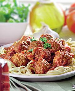 4. Într-o oală de 2 l, se pune apă, sare şi unt. Se lasă să clocotească şi se adaugă perişoarele din carne. Se lasă să fiarbă şi apoi se scot cu spumiera. Se pun în bolul cu sosul de roşii şi se servesc cu spaghetele încălzite în puţin unt sau ulei. Se ornează cu cimbru şi busuioc proaspăt.