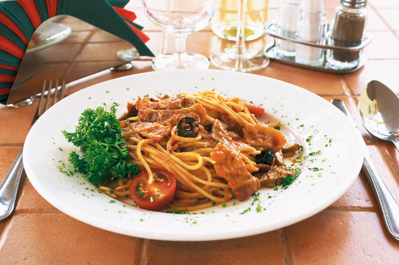 3. Pasta de roşii şi roşiile curăţate de coajă, tăiate cubuleţe, se adaugă la carnea înăbuşită. Se lasă în continuare la foc mic, până ce sosul scade şi se îngroaşă. Se potriveşte la gust cu sare şi piper, apoi se adaugă spaghetele fierte şi măslinele. Se amestecă uşor şi se aromează cu oregano şi pătrunjel verde.