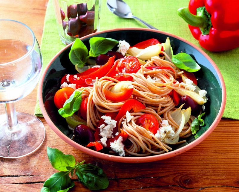 3. Se adaugă pastele peste sosul din tigaie, se amestecă, apoi se lasă la răcit. Înainte de a se servi, se adaugă cubuleţe de brânză şi măslinele.