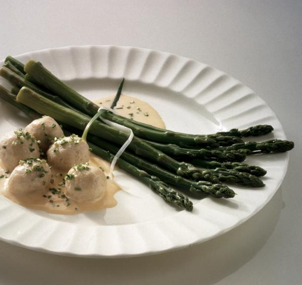 2. Pentru ca sparanghelul să fiarbă uniform, trebuie să stea în poziţie verticală. Într-o oală mai înaltă decât sparanghelul se pune apa, ca să acopere 1/3, şi se fierbe 9-15 minute, la foc potrivit. Se adaugă în apa de fiert 1 linguriţă de margarină, 1 linguriţă de sare pentru fiecare litru de apă, ½ linguriţă de zahăr, 1 linguriţă ulei şi câteva frunzuliţe de roiniţă.
