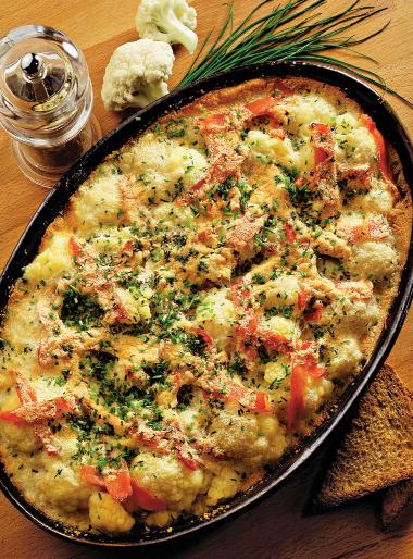 3. Conopida se scurge bine şi se aşează jumătate din cantitate în vas. Se pune peste ea jumătate din compoziţie şi 2/3 din cantitatea de şuncă, apoi restul de conopidă. Deasupra se toarnă restul compoziţiei şi se aşază în romburi fâşiile de şuncă rămase.