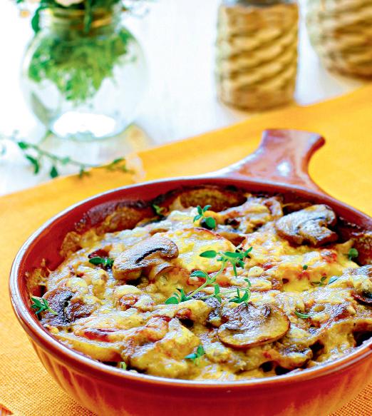 - Se tapetează tava de teflon sau de jena cu restul de unt şi cu pesmet şi se pune un rând de cartofi, unul de caşcaval ras, unul de ciuperci şi tot aşa.