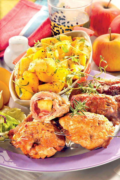 4. Pulpiţele se aranjează în tavă şi se bagă la cuptor acoperite cu usturoiul verde. După ce s-au frăgezit, se scot frunzele şi se lasă să se rumenească. Se servesc calde cu garnitură de mere coapte şi se ornează cu rozmarin şi cimbru verde.