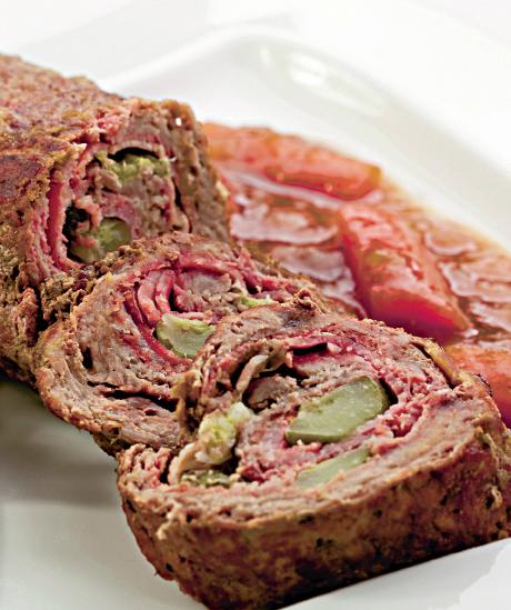 2. Castraveţii se scot din saramură, se spală, se feliază şi se aranjează pe bucata de carne. Se rulează, se prinde la capete dacă este nevoie cu scobitori şi se stropeşte cu puţin vin.