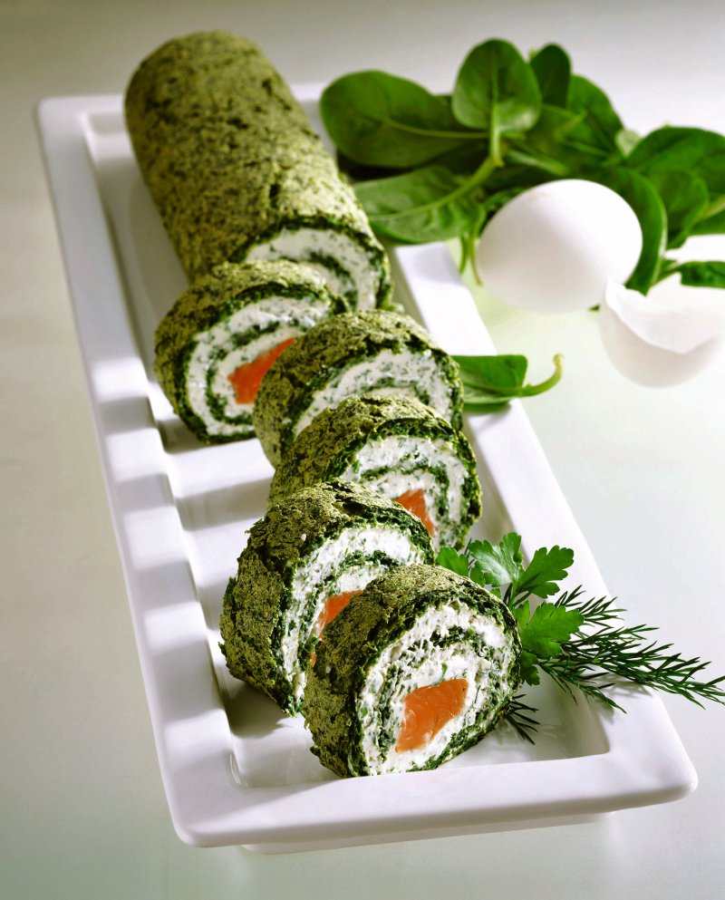 3. Se rad brânzeturile, se amestecă cu brânza de vaci pasată şi cu untul, până se obţine o pastă omogenă. Apoi, se întinde şi aceasta peste straturile de verdeaţă. La mijloc, se întind fâşii de somon afumat. Se rulează uşor, se strânge foarte bine, se leagă la capete şi se dă la rece peste noapte.