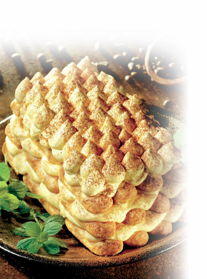 3. Se înmoaie pişcoturile în siropul din lichior de cafea şi se aşază primul strat într-o tavă. Se pune apoi un strat de cremă mascarpone, încă unul de pişcoturi şi iar cremă, până se umple tava. Deasupra prăjiturii se fac moţuri din frişcă cu ajutorul unui con pentru ornat. Se pudrează cu puţină cacao. Se serveşte rece, a doua zi de la preparare.