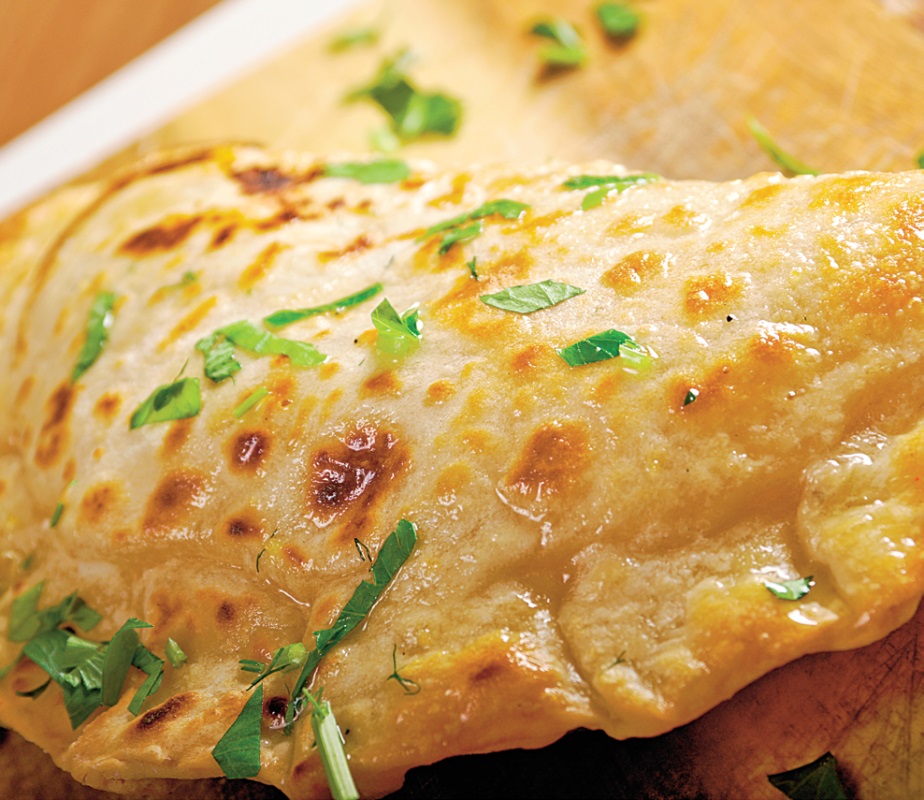 3. Se pune umplutura de brânză pe o jumătate de cerc, cu cealaltă jumătate se acoperă, şi marginile se plisează pentru ca brânza să nu curgă.