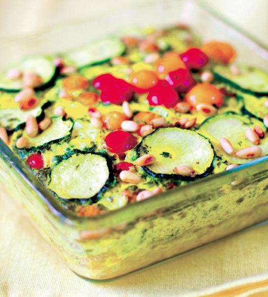 3. Se tapetează tava cu unt şi cu pesmet şi se toarnă compoziţia. Se întinde uniform, se ornează cu roşioare, cu rondele de dovlecei şi cu alune prăjite.