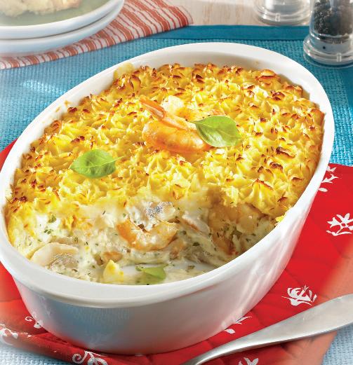 3. Se fierbe pe baie de abur, timp de 15-20 minute. Între timp, se face un piure din cartofi cu restul de unt, care se pune deasupra amestecului de peşte cu un poş.