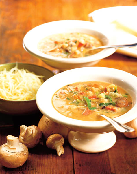 1. Se curăţă ciupercile, se spală şi se lasă să se scurgă în sită. Se desfac codiţele şi se pun să fiarbă în apă cu un praf de sare. După ce au fiert, se scot din zeamă şi se pasează cu blenderul. Între timp, se curăţă ceapa, dovleceii şi ardeii. Se taie cubuleţe, la fel şi pălărioarele ciupercilor şi se trec prin câteva jeturi de apă. Se călesc în unt, se adaugă apă, sare, piper şi concentrat de legume, se acoperă cu un capac şi se lasă să fiarbă.