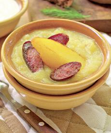 4. Se verifică dacă au fiert legumele, se scot din zeamă, ceapa se lasă de-o parte iar restul se pasează cu blenderul. Crema de cartofi se subţiază cu zeama în care au fiert, se potriveşte cu sare şi piper şi se adaugă smântâna. Se serveşte cu cârnaţii afumaţi rumeniţi pe grătar şi cu feliuţe de ardei copt.