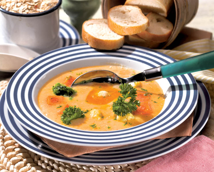 4. Se potriveşte după gust cu sare şi piper, se pune uleiul şi se mai lasă să fiarbă în 2-3 clocote. Se serveşte ornată cu rondele de morcovi, pătrunjel verde şi crutoane de pâine sau cu cereale.