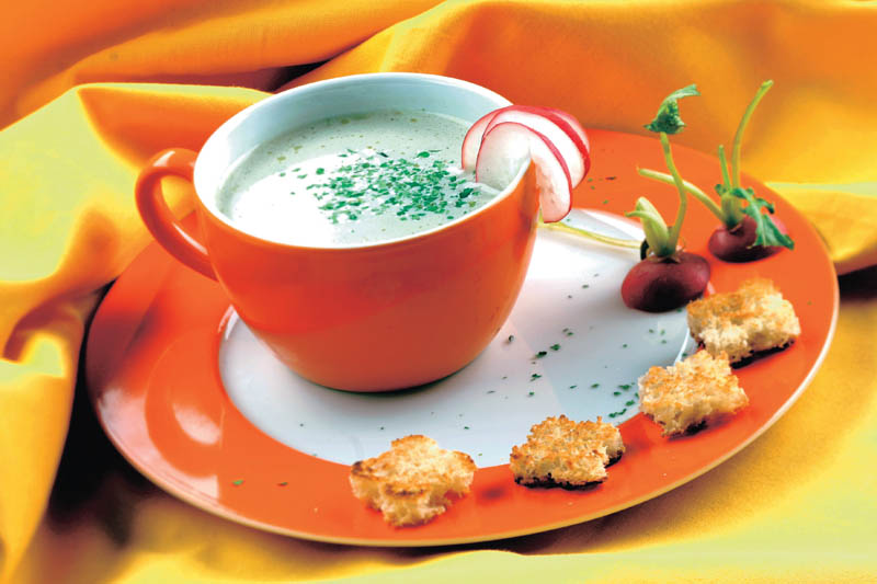 3. Se ia de pe foc şi imediat se drege cu smântâna. Se potriveşte la gust cu sare, piper şi pătrunjel verde tocat mărunt. Se serveşte cu ridichi şi crutoane.