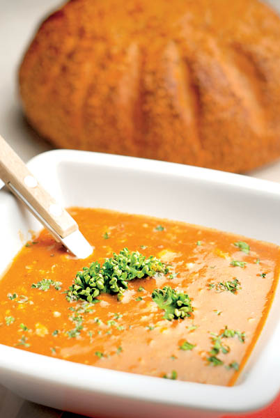 3. Piureul obţinut se răstoarnă în oala în care au fiert, peste zeama rămasă şi se mai mixează 5 minute până arată ca o supă cremă. Se mai lasă la fiert până dă în clocot de aproximativ 2-3 ori. Se stinge focul şi se serveşte cu pătrunjel verde şi crutoane de pâine prăjită sau pâine neagră de casă care se prepară după reţeta tradiţională. Supa cremă de morcovi este foarte bogată în vitamine şi este recomandată în special în alimentaţia copiilor.