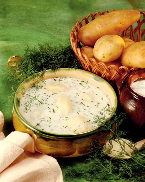 3. Jumătate din cantitatea de cartofi se trece printr-o sită deasă sau se mixează. Se subţiază cu supa în care au fiert legumele şi se pune din nou pe foc. Se condimentează după gust cu sare şi câteva fire de piper, amestecând continuu să nu se prindă de vas. Se adaugă untul, cealaltă parte de cartofi şi se mai lasă pe foc doar câteva clocote. Se drege cu smântână şi se aromează cu mărar.