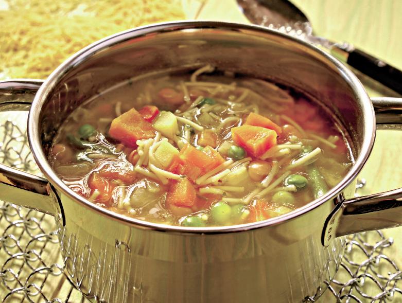 2. Într-o oală încăpătoare, se pun la fiert carnea, legumele şi cuburile de concentrat pentru supă de pui. Se amestecă din când în când. După aproximativ 30 de minute, se adaugă fideaua şi se dă focul la mic. Când e aproape gata, se potriveşte de gust cu sare şi piper.