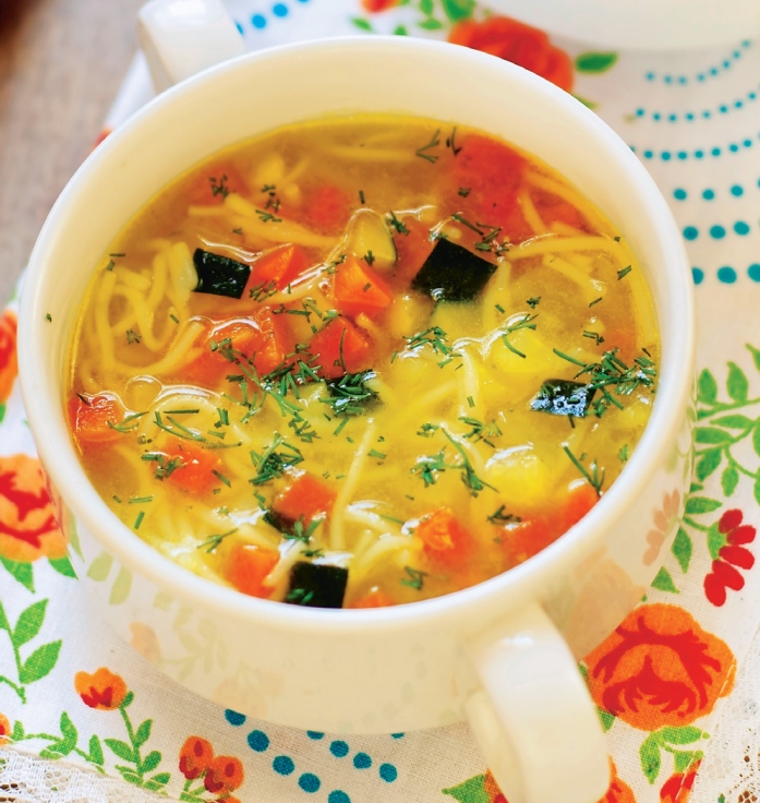 4. Se aduce supa la masă, fără carne, care se poate folosi la un alt preparat, presărată cu mărar.