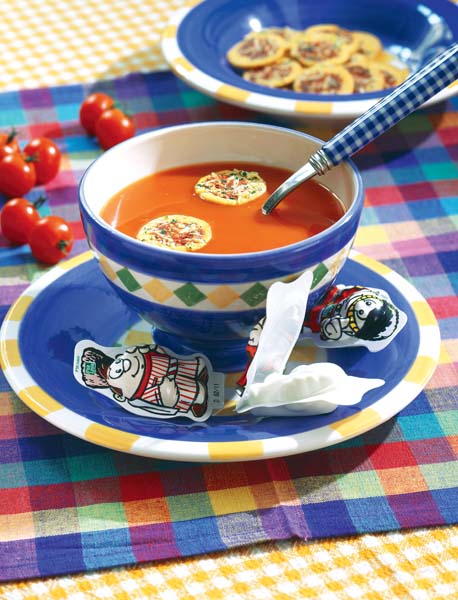 2. Între timp, roşiile se spală şi se taie în sferturi. Se storc, iar sucul rezultat se pune la fiert cu supa. Se lasă să fiarbă la foc mic, 15-20 minute. Se adaugă pipeptul de pui tăiat fâşii, se potriveşte la gust cu sare şi se aromează cu ţelină şi pătrunjel.