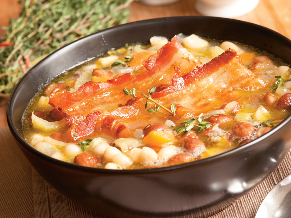 4.    Se lasă la fiert 20 de minute şi se aduce la masă cu bacon prăjit deasupra.