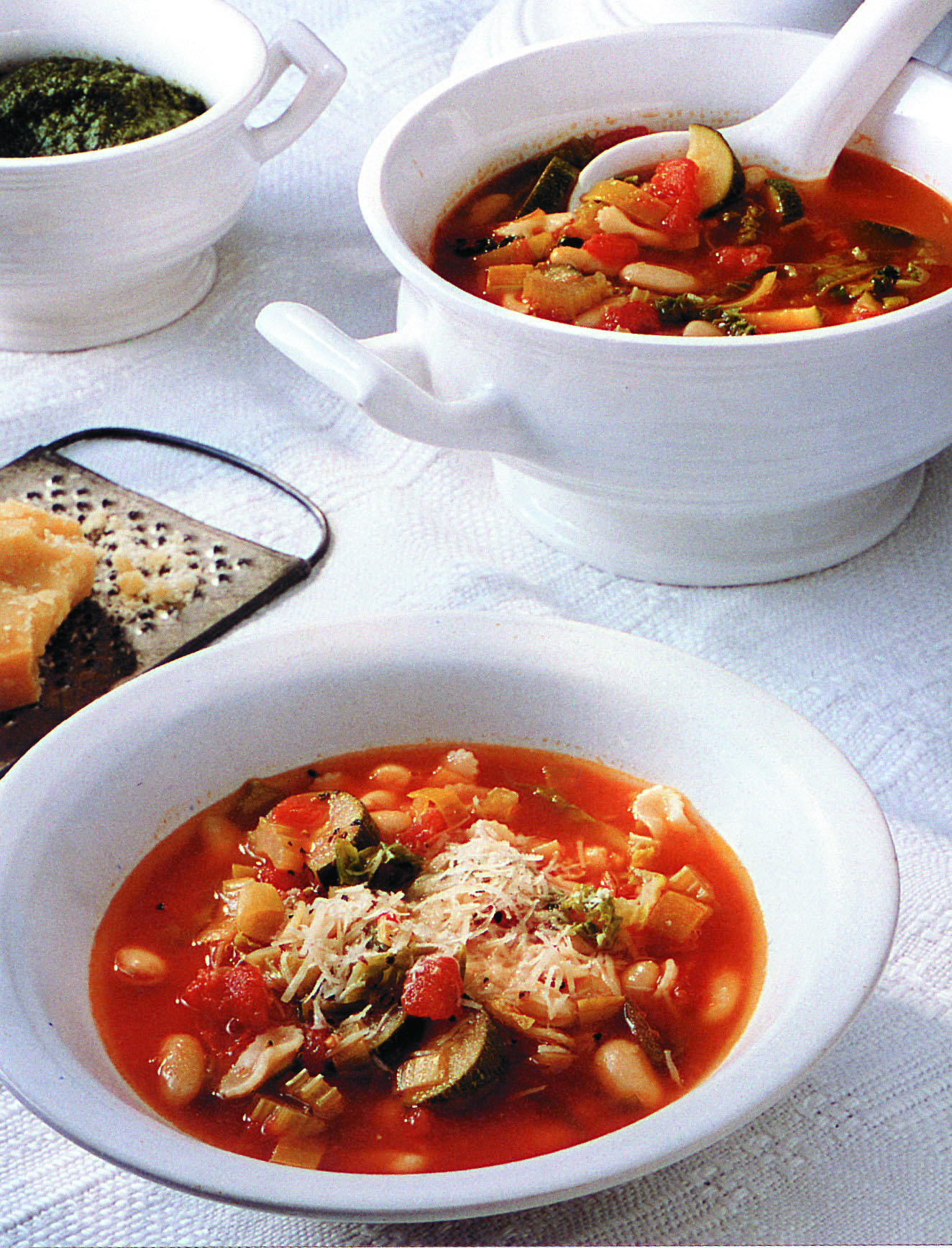 2. Se adaugă morcovul, rădăcina de pătrunjel şi ceapa, curăţate şi tăiate mărunt. După 15 minute se adaugă varza tocată mărunt, fasolea verde şi conopida ruptă în bucheţele mici. Se lasă să fiarbă în continuare, la foc potrivit.