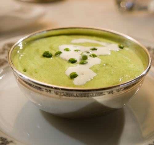 ► Se încinge untul în tigaie. Se pune ceapa la călit şi se amestecă bine, până devine aurie. Se toarnă şi supa şi se lasă să dea în clocot. Se dă focul mai mic şi se adaugă mazărea şi menta, păstrându-se câteva frunzuliţe pentru decor. Se condimentează cu sare şi piper şi se mai lasă pe foc aproximativ 20-25 de minute.
