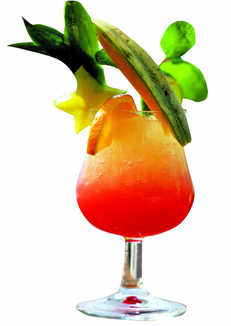 2. Se ornează cu jumătate de felie de portocală, cu o bucăţică de ananas şi cu frunze de mentă, apoi se serveşte.