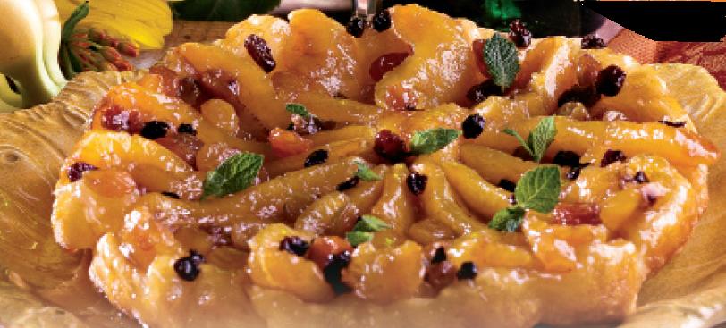 4. Se unge blatul de tartă cu siropul de fructe şi se adaugă budinca de vanilie. Se decojesc mandarinele şi se feliază. Se aşază peste budinca de vanilie stafidele şi feliile de mandarină.