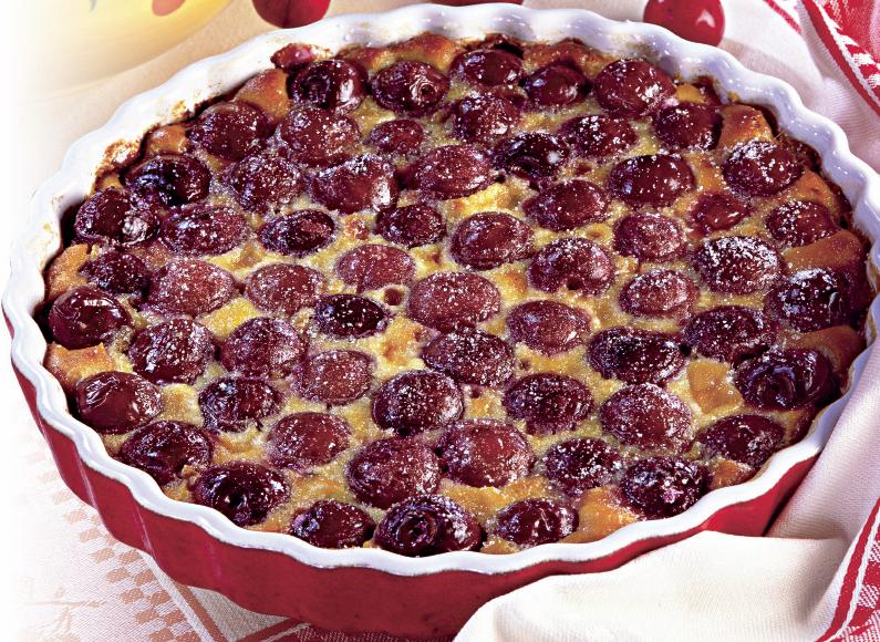 4. Compoziţia se toarnă în tava tapetată cu hârtie pentru copt, se întinde uniform şi se pun cireşele pudrate cu făină în prealabil. Cireşele se pudrează cu făină ca să nu se lase şi ca să dea un aspect plăcut prăjiurii. Se bagă în cuptor şi se lasă aproximativ 50 de minute să se coacă. După ce s-a copt, se scoate să se răcească şi se serveşte pudrată cu zahăr.