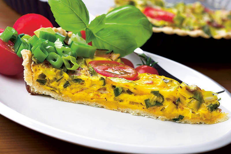 4. Se pune compoziţia de brânză, pe foaia de tartă, se întinde uniform şi se bagă în cuptorul încins. Tarta se serveşte ornată cu felii de roşii, de ardei şi frunze de busuioc.