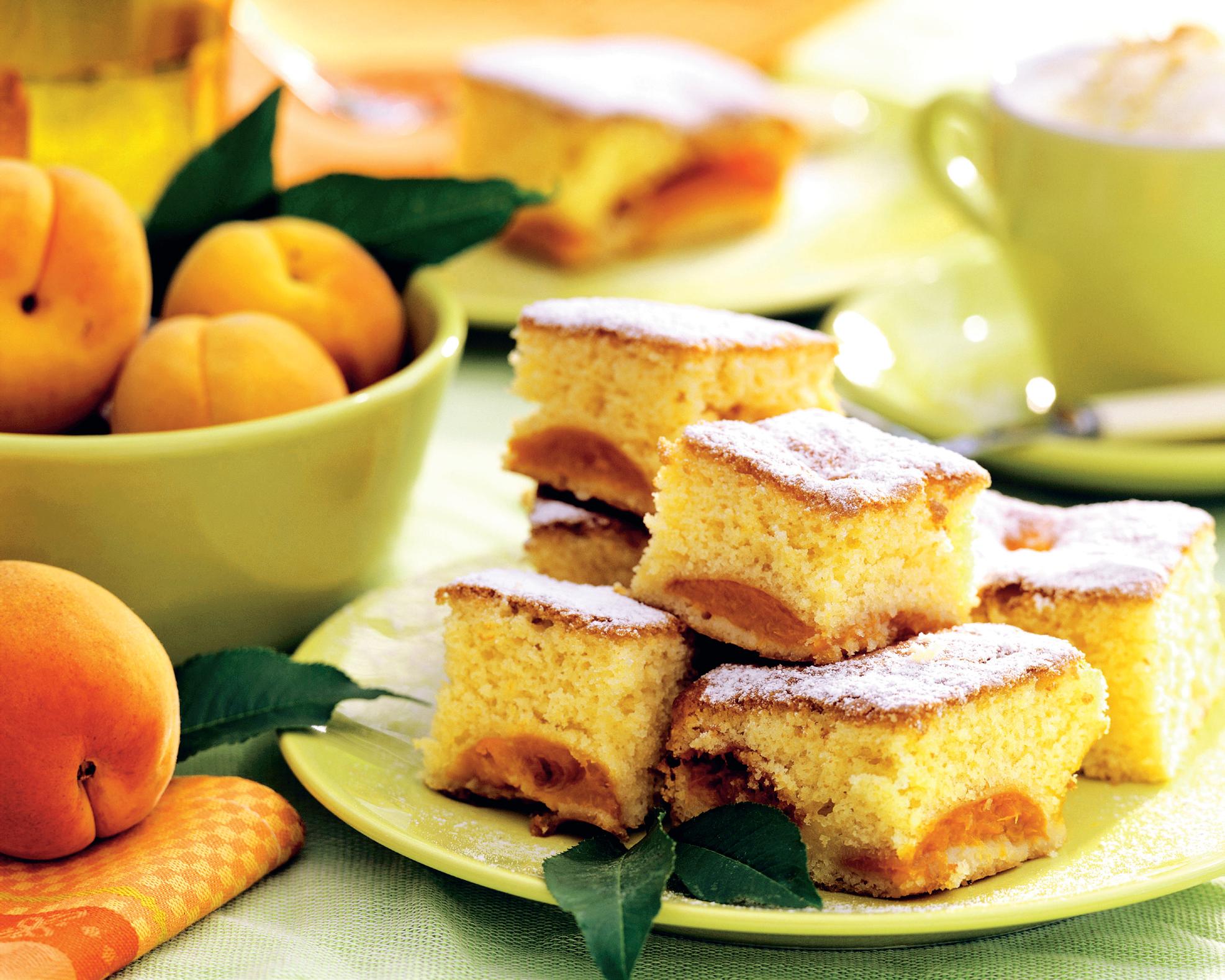 4. Se unge tava de copt cu unt. Compoziţia se toarnă în tavă, se întinde în strat uniform şi apoi se presară caisele tăiate în jumătăţi. Se dă la cuptor, la foc potri­vit, circa 50 de minute.